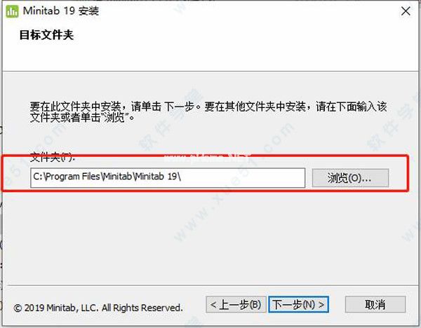 5.单击[浏览]更改安装路径。建议安装在c盘以外的磁盘上。您可以在D盘或其他磁盘中创建新的[Minitab19]文件夹,然后单击[下一步]。