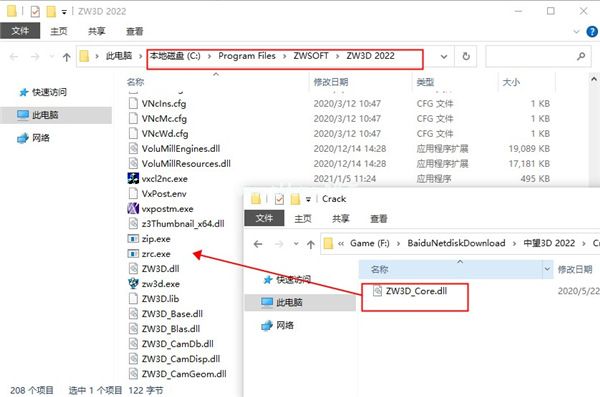 7.安装完成后,请勿运行软件。回到下载的数据包,将“破解”文件夹中的破解补丁“ZW3D_Core.dll”复制到软件的安装目录中,替换原来的文件。默认路径:c: \程序文件\ zwsoft \ zw3d2022。
