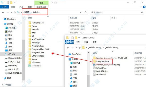 1.将破解文件中的ProgramData文件和mentor _ license _ server _ 11.16 _ x64文件复制到驱动器c以替换原始文件