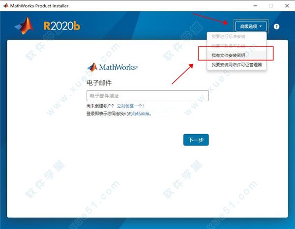 2.进入安装向导界面,提示电子邮件和用户登录,点击“高级选项”,选择“我有文件安装密钥”