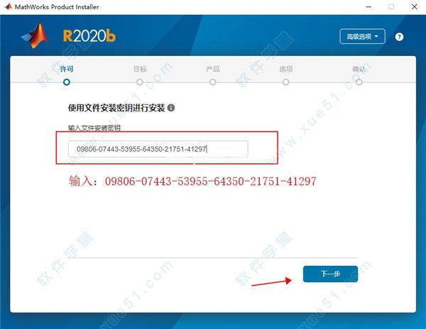 4.当安装到此步骤时,您需要填写安装序列号,输入安装密钥:09806-07443-53955-64350-21751-41297,然后单击“下一步”