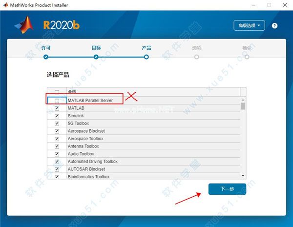 7.除“Matlab并行服务器”组件外,其他安装组件根据用户需求选择安装