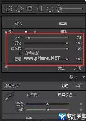 你可以用你的刷子。如果您沿着自定义效果设置滚动,您应该会看到画笔专用的整个部分。你可能很熟悉这些画笔的工作原理,但作为快速回顾:大小:定义画笔的大小。羽化:定义笔刷的硬度或柔软度(无论是沿着边缘淡化还是形成硬边缘)。过程:定义笔画的强度。把你的画笔设置成你喜欢的样子。我们把刷子放在较小的一边,有100的流动性和羽化。