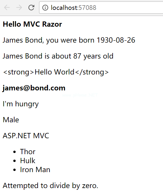 pJames债券约为@((DateTime .现在-出生日期)。天数/365)岁/p剃刀默认会对C#表达式进行超文本标记语言编码,观察下面的剃刀代码以及生成到页面上的超文本标记语言结构: