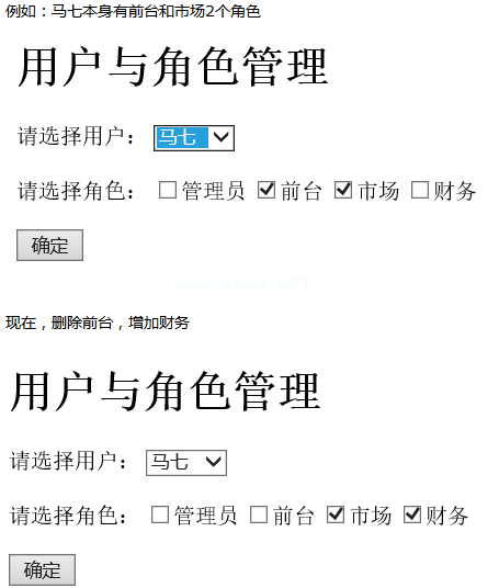 ?PHP $ uid=$ _ POST[' uid '];$ role=$ _ POST[' role '];//字符串$role=substr($role,0,strlen($ role)-1);$arr=explode('| ',$ role);要求一次./DBDA。上课。PHP ';$db=新DBDA();//删除$sdel='从用户_角色中删除,其中user suid=' { $ uid } $ db-query($ sdel);//添加foreach($ arr as $ v){ $ SQL=' insert in users _ roles值(0,' {$uid} ',' { $ v } ')';$ db-查询($ SQL);} 效果如图: