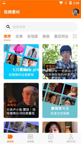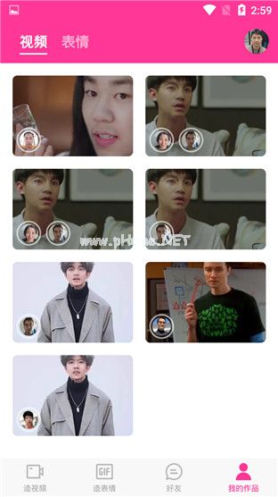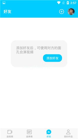 ZAO主要分为四个板块:创作视频、创作表情、好友、我的作品,四个板块。