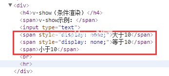 Div h4v-show(条件渲染)/h4 spanv-show示例:/span输入类型=' text ' v-model=' number '/Span v-show=' number 10 '大于10/Span v-show=' number=' 10 '等于10/Span v-show=' number 10 '小于10/spanbr//div。将上述示例中的所有说明替换为v-show,页面如下所示