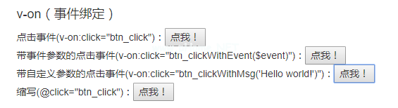 Div h4v-on(事件绑定)/H4 span v-预点击事件(v-: click=' BTN _ click '):/span button v-: click=' BTN _ click ' type=' button '点击我!/button br/span v-带有事件参数的预点击事件(v-: click=' BTN _ clickwithevent($ event)'):/span按钮v-: click=' BTN _ clickwithevent($ event)'类型='按钮'点击我!/button br/span v-带有自定义参数的预点击事件(v-: click=' BTN _ clickwithsg(' hello world!)'):/span button v-: click=' BTN _ clickwithsg(' Hello world!)' type='button '点击我!/buttonbr/span v-pre缩写(@ click=' BTN _ click '):/span button @ click=' BTN _ click ' type=' button '点击我!/button /div页面的效果如下