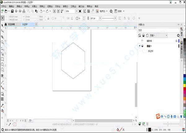 2.打开CDR矢量绘图软件后,直接用快捷键Ctrl+n新建一个文档,点击左侧工具栏中的多边形工具。最初的设定是五边形。单击顶部的工具栏以增加边的数量来绘制六边形。按下并拖动它到合适的大小。