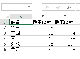 姓名,期中成绩,期末成绩张三,58,95李四,98,74王二,47,38刘能,15,100黄武,87,68徐克开门红如下: