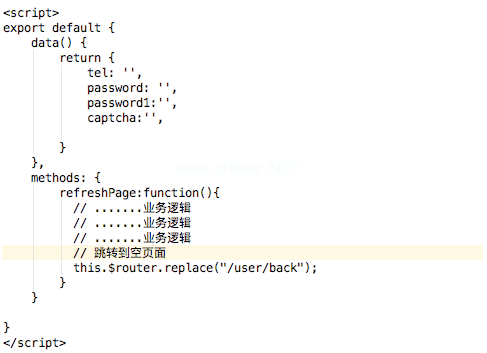 如上图所示,我们定义了一个refreshPage方法,它是对特定事件的回调。在这种方法中,我们将处理业务逻辑,然后使用vue的路由器跳转到一个空页面。这个空页面的路由路径是/user/back。这条路随便走,你可以选择自己的路。