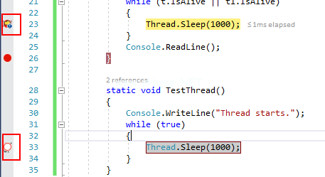 在调试过程中,调试工具栏中有一个名为“在源代码中显示线程”的新选项。单击后,在线程停止的代码行前面会显示一个图标。鼠标停留在图标上以显示线程,右键单击图标以显示可用的操作。