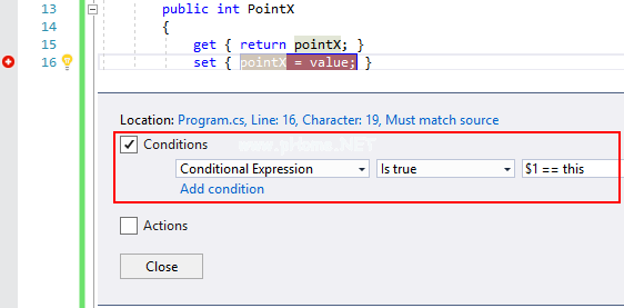 此时,实例a被分配给$1,右键单击要添加的断点,选择条件…