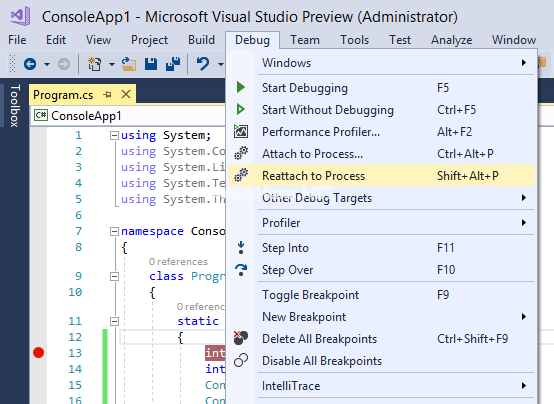 首先附加到进程,单击停止调试,然后单击调试以查看内部的重新附加到进程选项。