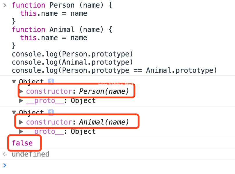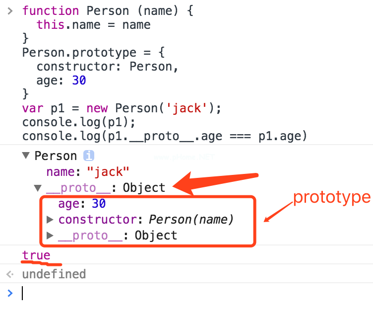 函数Person(name){ this . name=name } Person . prototype={//constructor : Person,Age: 30} console.log (person。原型)//对象{age: 30} console.log(人。prototype . constructor===person)//false tips:为了证明可以为构造函数手动创建‘prototype’,在这里添加‘prototype’