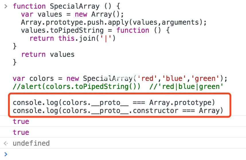 那么寄生构造器模式的应用场景是什么呢?例如,根据《javascript高级程序设计》一书,如果我们想用额外的方法创建一个特殊的数组,那么我们可以这样做: