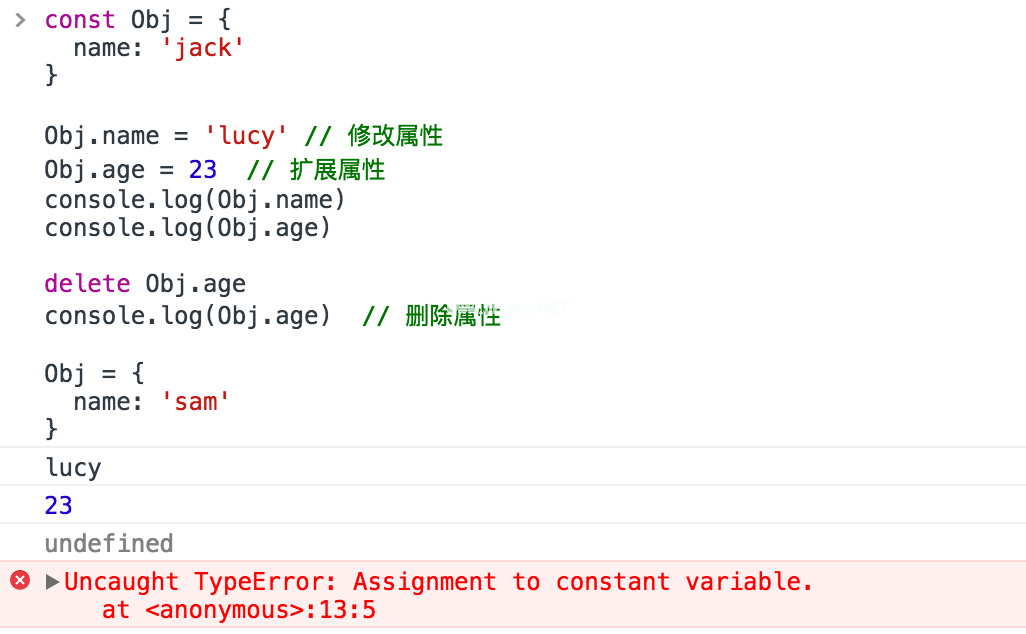 结果表明,对象常量的引用地址不允许修改,但属性仍然可以修改、扩展和删除