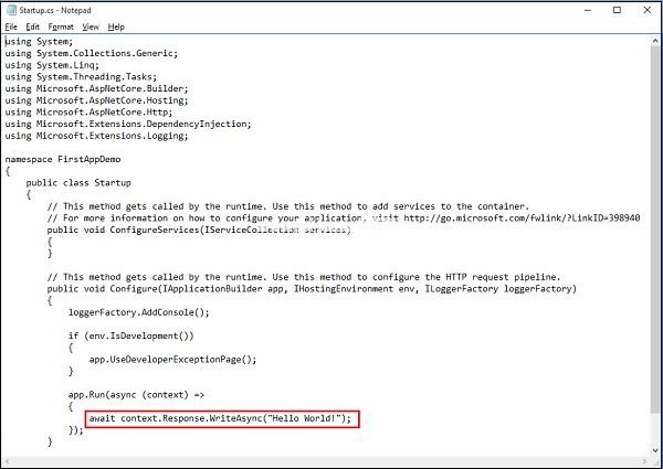 使用系统;使用系统。集合。通用;使用系统。Linq使用系统。线程化。任务;使用微软。AspNetCore . Builder使用微软。托管;使用微软。AspNetCore . Http使用微软。扩展。依赖注射;使用微软。扩展。日志记录;命名空间FirstAppDemo {公共类Startup { //此方法由运行时调用。//使用此方法向容器中添加服务。//有关如何配置应用程序的更多信息,请访问http://go.microsoft.com/fwlink/? LinkID=398940 public void ConfigureServices(IServiceCollection services){ }//此方法由运行时调用。//使用此方法配置HTTP请求管道。public void Configure(IApplicationBuilder应用程序,IHostingEnvironment env,ILoggerFactory logger factory){ logger factory。AddConsole();if (env。IsDevelopment()){ app。usedeveloper exception page();} app。run(async(context)={ wait context。回应. WriteAsync('Hello World!这个ASP.NET核心应用程序’);});}}}在文本编辑器中按Ctrl+S保存此文件,然后返回到web浏览器并刷新应用程序。