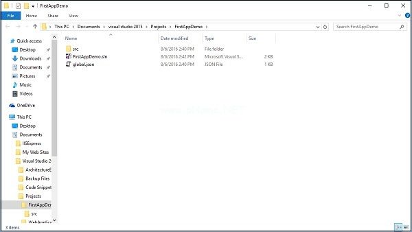 您将看到它的根目录中有两个文件:firstappmode.sln和global.json