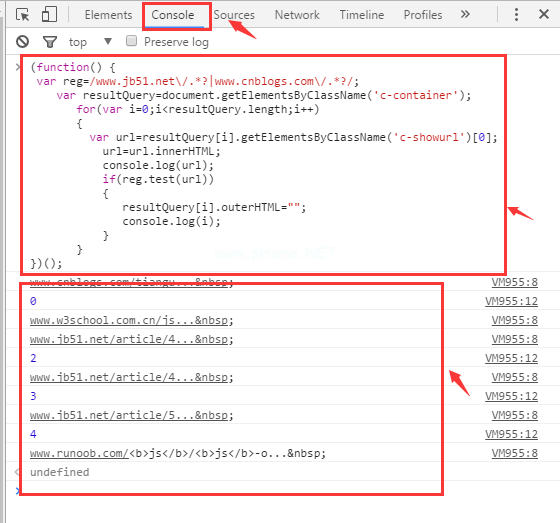 (function(){ var reg=/www . JB 51 . net \/。*?|www.cnblogs.com\/。*?/;var resultQuery=document . getelementsbyclassname(' c-container ');for(var I=0;iresultQuery.lengthi ) { var url=resultQuery[i]。getElementsByClassName(' c-show URL ')[0];url=url.innerHTMLconsole . log(URL);if(reg . test(URL)){ resultQuery[I]。外套HTMl=' ';console . log(I);} }})();//使用原生js操作dom//20161121用法: