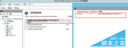 在左上角的配置节点中选择system.webServer/applicationInitialization,其他配置以红色圆圈显示,如下图所示: