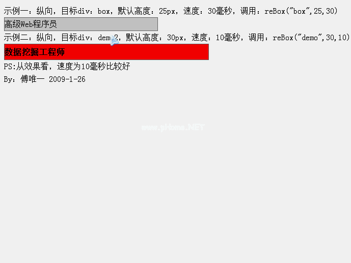!DOCTYPE HTML PUBLIC '-//W3C//DTD HTML 4.01 Transitional//EN ' HTML标题js DIV卷帘效果示例-F-BLOG/title meta http-equiv=' Content-Type ' Content=' text/html;charset=UTF-8 ' style type=' text/CSS ' # box { overflow :隐藏;高度:25pxborder:1px固体# 666;宽度宽度:300像素背景色: # CCC} p { padd :0 pxmargin :0 px线高:25 px} # demo2 { overflow:hidden高度:30 pxborder:1px固体# 666;宽度宽度:400像素背景-颜色: # ff 0000} H4 { padd :0 pxmargin :0 px高度:30 px线高:30 px}/样式脚本类型='text/javascript '函数reBox(Fid,默认高度,速度){ var BH八字=defaultHeightvar doScrollvar a=0,b=0;var $=function(id){返回文档。getelementbyid(id);} var CreateBox=' div id=' Fid ' cbox ' ' $(Fid).innerHTML '/div ';$(Fid).innerHTML=createBox$(Fid).onclick=function(){ if(a==0b==0){ b=1;doscoll=SetInterval(function(){ if(BH three $(' Fid ' cbox ')).offset theight){ var dist=math。天花板($(“Fid ' cbox”).偏移ThEight-BH h8)/10);钅波八字=八字距离;$(Fid)。风格。高度=BH三' px ';} else { clearInterval(DocRoll);a=1;b=0;} },速度);} if(a==1b==0){ b=1;doscoll=set interval(function(){ if(BH threaddefaultheight){ var dist=math。天花板((BH螺纹-默认高度)/10);钅波八字=八字-区;$(Fid)。风格。高度=BH三' px ';} else { clearInterval(DocRoll);a=0;b=0;} },速度);} } }窗口。onload=function(){ reBox(' box ',25,30);reBox('demo2 ',30,10);}/脚本/头体P示例一:纵向,目标div:box,默认高度:25px,速度:30毫秒,调用:reBox('box ',25,30)/P div id='box' p高级网程序员/p p1、了解超文本传送协议协议,对网程序性能优化有一定经验/p p2、精通关系型数据库数据库,能熟练地运用结构化查询语言语言,有丰富的数据建模经验,熟悉结构化查询语言语句调优和数据库调优/p p3,1 .熟练使用至少一种版本(SVN简历)控制工具/p p4、熟悉服务器端编程语言(专业超文本预处理器的缩写)语言及常见扩展(如mysql、pcre、xml等)/p p5,熟悉面向对象(OO)程序设计/p /div P示例二:纵向,目标div:demo2,默认高度:30px,速度:10毫秒,调用:reBox('demo ',30,10)/P div id='demo2' h4数据挖掘工程师/h4 p1、对海量数据分析、挖掘有浓厚兴趣,沉稳厚重/p p2、熟悉PHP、JavaScript、HTML设计开发/p p3,1 .了解超文本传送协议协议,对程序性能优化有一定经验/p p4、精通关系型数据库数据库,能熟练地运用结构化查询语言语言/p/div PPS 3360从效果看,速度为10毫秒比较好/p pBy:傅唯一2009-1-26/p /body/html2、运行效果图如下: