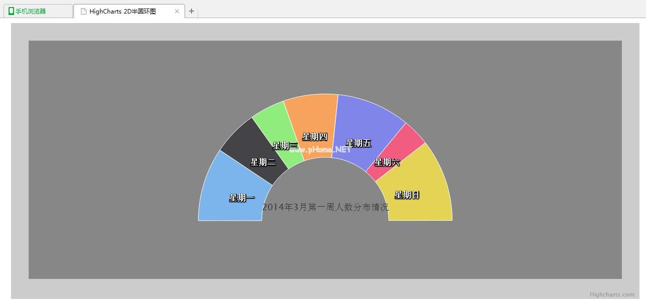 !2D半圆环图/title脚本类型=' text/JavaScript ' src=' http : js/jquery-1。7 .2 .量滴js '/script脚本类型=' text/JavaScript ' src=' http : js/high charts。js '/script脚本类型=' text/JavaScript ' $(function(){ $(' # halfDonutChart ')).高图表({ chart : { plotbackground color : ' # 878788 ',plotBorderWidth: '50px ',plotShadow: true },title: { text: '2014年3月第一周人数分布情况,align: '中心',verticalAlign: '中间',y: 100 },工具提示: { pointformat : ' { series。名称} : {点。百分比:1 f } % ' },绘图选项3360 {饼图: {数据标签: {启用d : true,距离: -80,样式33: {字体粗细33330 }人数比例,innerSize: '50% ',data: [ ['星期一', 878454], ['星期二', 542155], ['星期三', 415542], ['星期四', 651212], ['星期五', 874545], ['星期六', 326566], ['星期日', 984545] ] }] });});/script/head body div id=' halfDonutChart ' style=' width : 1250 px;高度: 550像素;边距: 0自动/div/body/html 2,运行效果图:
