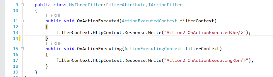 这个接口定义了两种方法。在MVC框架调用动作方法之前,它将调用OnActionExecting方法。调用操作方法后,调用OnActionExecuted方法。