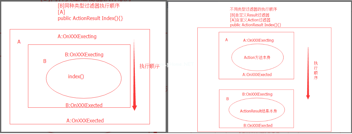 执行顺序:同类型的过滤器执行顺序接近方法的第一次执行,不同类型的过滤器一般执行顺序为【authorize-action-action result】。至于异常过滤器,只要抛出异常,它们就会被执行。如果要调整执行顺序,可以通过调整Order方法的值来控制执行顺序。值越小,执行越早。下图是操作/结果过滤器应用程序的执行序列图