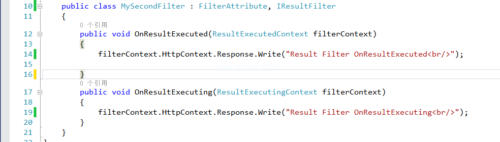 将结果筛选器应用于操作方法时,在操作方法返回操作结果之前调用OnResultExecuting方法,在操作结果返回之后调用OnResultExecuted方法。以下示例用于计算操作方法返回的结果的运行时间。代码如下: