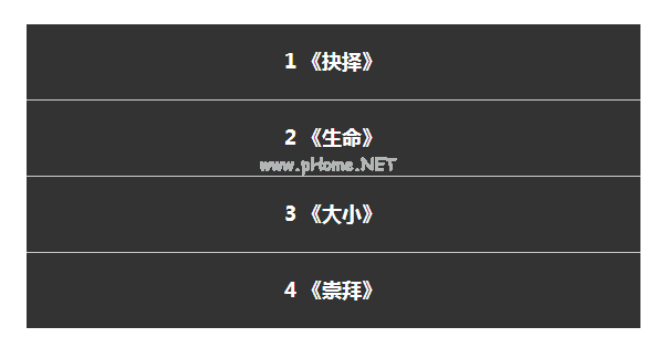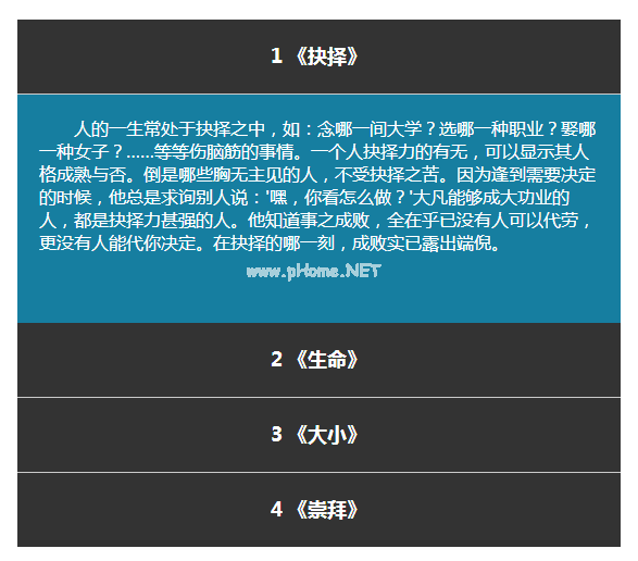 !DOCTYPE html html lang=' en ' head meta charset=' utf-8 ' style * { margin 3360 0;padd : 0;} .面板{ width: 555pxheight: auto背景色: # 333333;margin: 50px自动;} .面板标题{宽度: 100%;高度: 68px;文本对齐:中心;Font: 600 18px/68px '微软雅黑';color: # fffcursor:指针;} .折叠{ width : 100%;高度: 0;背景-颜色: # 167 ea0;飞越:隐藏;} .折叠p { color: # fffFont: 500 16px '微软雅黑';text-indent : 2em;padding: 20px 20px 0 20px} #一,#二,#三{边框-top:实心1px # ccc}/style/head Body div class=' panel ' id=' panel ' H4 class=' panel-title ' id=' panel-title ' 1 《抉择》/H4 div class=' collapse ' id=' One ' p/p/div H4 class=' panel-title ' id=' panel-title ' 2 《生命》/H4 div class=' collapse ' id=' Tow ' p/p/div H4 class=' panel-title ' id=' panel-title ' 3 《大小》//管理timer obj.timer=setinterval(函数(){//timer开关,用于判断timer var标志是否=true//traverse JSON for(var arrt in JSON){//计算步长=目标位置-当前位置var step=(JSON[arrt]-par sent(getstyle(obj,arrt)))/5;//步长舍入步长=步长0?数学天花板(台阶):数学地板(台阶);//盒子移动:框的当前位置步长为圆角obj . style[arrt]=par sent(get style(obj,arrt))步长' px ';//只要其中一个不满足条件,定时器if(parsent(getStyle(obj,arrt))就不会停止!=JSON[arrt]){ flag=false;} }//关闭定时器if(flag){ clear interval(obj . timer);//2秒后执行回调函数setTimeout(函数(){ //判断是否有回调函数,如果有endfn则执行回调函数endfnndfn();},1000) } },20);}//获取当前样式函数getStyle(obj,arrt){ //兼容ie return obj.currentStyle?obj . current style[arrt]: GetComputed style(obj,null)[arrt];} var panel=document . getelementbyid(' panel ');var oH=panel . getelementsbytagname(' H4 ');var oDiv=panel . getelementsbytagname(' div ');Var str=['人的一生往往都在做一个选择,比如:去哪个大学读书?选择哪个职业?你娶什么样的女人?等等伤脑筋的事情。一个人选择能力的存在,可以说明他的人格是否成熟。但是那些没有主见的人,并没有因为选择而痛苦。因为在做决定的时候,他总是会问别人,‘嘿,你觉得怎么样?大多数能取得巨大成就的人都是有强烈选择的人。他知道事情的成败,因为没有人能替他做,也没有人能替你决定。在选择的那一刻,成败已经揭晓。“生命也许是宇宙间唯一值得崇拜的东西。孕育、诞生和展现生命的本质是一个极其激动人心的过程。生活就像音乐和图画一样,暗地里承载着一种注定的色调或色彩。当它遇到春潮的翻滚,当它听到号角的催促时,它会突然活跃起来,展现出它华丽而热情的本性。当然,这种本质更可能是卑鄙、懦弱和无聊的;它的主人别无选择。诚然,生活是希望。应该说,卑鄙和庸俗不应该过早自满,也不应该误认为它们已经成功地消除了高贵和纯洁。伪装也不能持久,因为时间就像一条长河,卑鄙的人、奸商、庸俗的棍棒不可能永远戴着教育家、诗人、军人的桂冠。在他们畅通无阻的职业生涯结束时,他们的后代将长期感到羞辱。”一个朋友谈到了他亲戚的阿姨,她从来不穿适合她生活的鞋子,经常穿着大鞋子到处走。如果小儿子问她,她会说:‘各种尺码的鞋子价格都一样,为什么不买大一点的呢?每次我讲这个故事,都有人笑得喘不过气来。