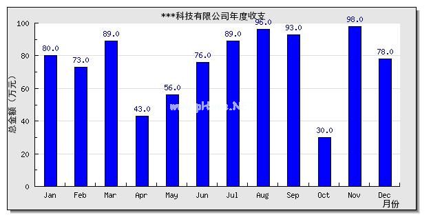 ?PHP require _ once ' jpgraph/src/jpgraph . PHP ';//导入Jgraph类库require _ once ' Jgraph/src/Jgraph _ bar . PHP ';//导入Jpgraph类库的直方图函数$ data=array (80,73,89,43,56,76,89,96,93,30,98,78);//set statistics $ xdata=array(' Jan ',' feb ',' mar ',' apr ',' may ',' jun ',' jul ',' aug ',' sep ',' oct ',' nov ',' dec ');$graph=新Graph(600,300);//设置画布大小$ graph-SetScale(' text Lin ');//设置坐标刻度类型$ graph-SetShadow();//设置画布阴影$ graph-img-设置边距(40,30,20,40);//设置统计图$barplot的边距=新bar plot($ data);//实例化BarPlot对象$barplot-SetFillColor('蓝色');//设置直方图$barplot-value-Show()的前景色;//显示$ graph-Add($ bar plot);$ graph-title-set (iconv ('utf-8 ',' gb2312//ignore ',' * * *科技有限公司年度收支');//设置title iconv防止中文乱码$ graph-xaxis-title-set(iconv(' utf-8 ',' gb2312//ignore ',' month ');//设置x轴名称$ graph-xaxis-settick labels($ xdata);//设置x轴标注$ graph-yaxis-title-set(iconv(' utf-8 ',' GB 2312//忽略','总金额(万元)');//设置y轴名称$ graph-title-setfont (ff _ simsun,fs _ bold);//设置标题字体$ graph-xaxis-title-set font(ff _ simsun,fs _ bold);//设置x轴字体$ graph-yaxis-title-set font(ff _ simsun,fs _ bold);//设置y轴字体$ graph-Stroke();//输出图像的运行结果为: