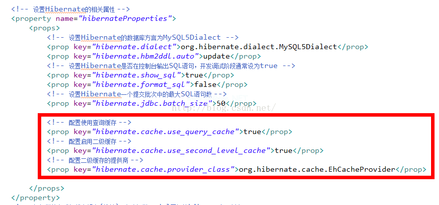 !-配置为使用查询缓存-prop key=' hibernate . cache . use _ query _ cache ' true/prop!-配置并启用L2缓存-prop key=' hibernate . cache . use _ second _ level _ cache ' true/prop!-配置L2缓存的提供程序-prop key=' hibernate . cache . provider _ class ' org.hibernate.cache.ehcacheprovider/prop