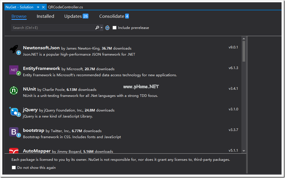 由于我使用的是VS15Preview4,所以可以直接使用nuget可视化管理工具进行安装:工具-nuget包管理器-管理用于解决方案的Nuget包…,打开如下界面: