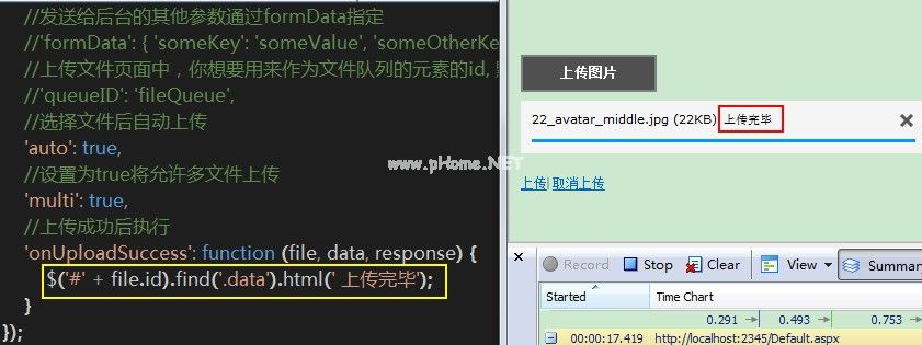 OnUploadSuccess”事件可以设置上传完成后要执行的代码,修改后的代码为: