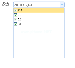 !DOCTYPE html PUBLIC '-//W3C//DTD XHTML 1.0 Transitional//EN ' ' http://www .w3。org/TR/XHTML 1/DTD/XHTML 1-Transitional。DTD ' html xmlns=' http://www .w3。org/1999/XHTML '标题利用易居实现多选下拉框/title link rel='样式表type=' text/CSS ' href=' Easyui/Easyui。CSS '/脚本类型=' text/JAVAScript ' src=' http : Easyui/jquery。量滴js /脚本类型=' text/JAVAScript ' src=' http : Easyui/jquery。易用户。量滴js /脚本脚本类型=' text/JavaScript ' $(function(){ $(' # ddyline ')).combotree({ valueField: 'id ',//Value字段文本字段: '文本',//文本字段multiple: true,data: [{ 'id': 1,' text': 'All ',' children': [{ 'id': 13,' text': 'C1' },{ 'id': 14,' text': 'C2' },{ 'id': 15,' text': 'C3'},//URL 333:数据源onCheck:函数(节点,选中){ //让全选不显示$(' # ddyline ').combotree('setText ',$(' # ddyline ').combobox('getText ').toString().替换('全选,', ''));},onClick:函数(节点,选中){ //让全选不显示$(' # ddyline ').combotree('setText ',$(' # ddyline ').combobox('getText ').toString().替换('全选,', ''));} });})/剧本/床头柜多选:选择id=' ddyline ' class=' easy ui-combo tree ' style=' width : 205 px;'height : 24px '/select/body/html三、效果
