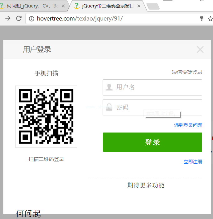 用户登录是很多网站的必备功能。一种方式是无论在网站的哪个页面,点击登录按钮都会弹出一个蒙版图层,显示用户登录的对话框。这种方法灵活方便。目前扫描二维码登录也很常见,比如QQ、微信、百度等等。现在为什么要求推荐一个有二维码的登录弹出层,可以拖拽关闭,有需要的朋友可以参考。
