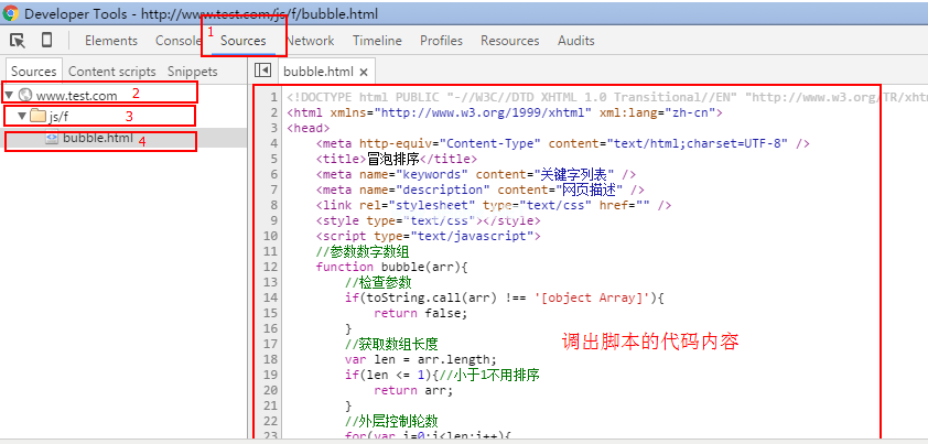 选择断点后,在Google浏览器中再次运行脚本,即运行下面的www.test.com/js/f/bubble.html然后进入车内