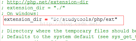 去掉分号后,就可以连接到mysql或MyQLI中的数据库了。以后用其他PDO连接数据库的时候,可以根据教程取消后面PDO的标题。然后,找到' extension_dir='并填写自己的动态链接库文件夹路径,即/php/ext,例如我的php下的ext包的路径是D:\studytools\php\ext,所以设置为下图中的红框。这样,我们给出了php中包含的动态链接库的path,并建议将ext的path添加到计算机环境变量的Path中。