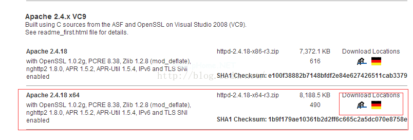 Apache下载:http://www.apachehaus.com/cgi-bin/download.plx是下载界面的直接链接。Apache可以直接下载最新版本。出于兼容性考虑,建议选择VC9版本。具体的区别在网页上有说明,在此不再赘述。