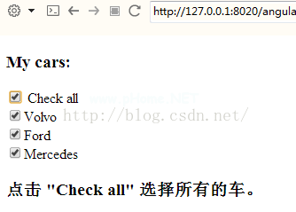 !DOCTYPE html html hearteta charset=' utf-8 '/title anglarjs/title script src=' http : js/angular。量滴js '/script/head body ng-app=' h3My cars :/H3输入类型='复选框' ng-型号='全部'全选br输入类型=' checkbox ' ng-checked=' all ' Volvo br输入类型=' checkbox ' ng-选中=br的' all '输入类型='复选框' ng-选中='全部'点击全部检查选择所有的车/H3/body/html