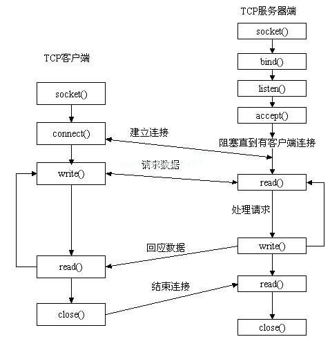 让我们从服务器开始。服务器首先初始化Socket,然后绑定到端口,监听端口,调用接受阻塞,等待客户端连接。此时,如果客户端初始化一个套接字,然后连接到服务器,如果连接成功,客户端和服务器之间的连接就建立了。客户端发送数据请求,服务器接收并处理请求,然后将响应数据发送给客户端,客户端读取数据,最后关闭连接,第一次交互结束。