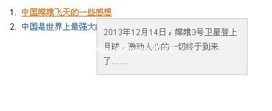 !DOCTYPE html PUBLIC '-//W3C//DTD XHTML 1.0 Transitional//EN ' ' http://www .w3。org/TR/XHTML 1/DTD/XHTML 1-Transitional。DTD ' html xmlns=' http://www .w3。org/1999/XHTML '标题跟随鼠标的文字提示框/title meta http-equiv=' Content-Type ' Content=' text/html;charset=utf-8 '/style type=' text/CSS ' body { font :12 px/1.8 arial;}a、a :访问过{ color : # 3366 cc文本装饰:无;} a:hover { color: # f60文本修饰:下划线;}.tip { width :200 pxborder :2 px实心# dddpadding:8px背景# f1 f1 color : # 666 } img { border : none }/style脚本类型=' text/JavaScript ' var tip={ $ : function(ele){ if(ele的类型)=' object ')return ele;else if(ele的类型)=' string ' | | type的类型=' number ')返回文件。getelementbyid(ele。tostring());返回null},mousePos:function(e){ var x,y;var e=e | | window.event返回{ x : e . clientx文档。尸体。向左滚动文档。文档元素。向左滚动,y : e . clienty文档。尸体。滚动顶部文档。文档元素。滚动顶部};},启动:函数(obj){ var self=this;var t=自我$(“mjs : tip”);物体。onmousemove=function(e){ var mouse=self。mouse pos(e);t .风格。left=鼠标。x 10 ' pxt .风格。top=鼠标。y 10 ' pxt . innerhtml=obj。GetAttribute(' tips ');t .风格。display=};物体。onmouseout=function(){ t . style。显示='无';};} }/script/head dyollia href=' # ' target=' _ blank ' on mouse over=' tip。start(this)' tips=' 2013年12月14日,嫦娥3号卫星登上月球,激动人心的一切终于到来了……'中国嫦娥飞天的一些感想/a/lilia href=' # ' target=' _ blank ' on mouse over=' tip。开始(这个)“提示=”中国未来一定是世界上最强大的国家,你相信么?'中国是世界上最强大的国家/a/Li/oldiv id=' mjs : tip ' class=' tip ' style=' position : absolute;left :0 top :0 display : none/div/body/html希望本文所述对大家的爪哇岛描述语言程序设计有所帮助。