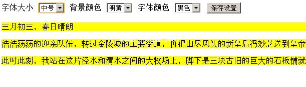 !DOCTYPE html PUBLIC '-//W3C//DTD XHTML 1.0 Transitional//EN ' ' http://www . w3 . org/TR/XHTML 1/DTD/XHTML L1-Transitional . DTD ' html xmlns=' http://www . w3 . org/1999/XHTML ' head title/title script type=' text/JavaScript ' src=' http 3360 js/jquery 1 . 3 . 2 . js '/script script type='ready(function() { $('#fontsize '))。change(function() { $('p '))。CSS({ font size : this . value });//dom } ) //更改字体颜色$('#backgroundcolor ')。change(function() { $('p '))。CSS({ background : this . value });} ) //更改背景颜色$('#fontcolor ')。change(function() { $('p '))。CSS({ color : this . value });} )});/script/headsdydiv id=' formstylecontrols ' Label for=' font size ' font size/label select id=' font size ' Option value=' 12px ' small/Option value=' 14px ' small/Option value=' 16px '中/选项值='18px '大/选项值='24px '大/选项/select label for='背景背景'背景色/Label select id='背景色'选项值=' # f4fbff ' default/选项值='gray ' 选项选项值='黄色'亮黄色/选项/选择标签为=' font color' font color/label选择id=' font color '选项值=' # 00000 '黑色/选项选项值=' # Ff0000 '红色/选项选项值='#006600 '绿色/选项值='#0000ff '蓝色/选项值='#660000 '棕色/选项/选择标签输入类型=' submit' id=' style '值=' save settings '/label 然后把风头正盛的新皇后冯妙芝送到皇帝选定的洞房柔光殿。 好时的大臣、亲戚和朋友已经相继退休,不久,皇后将携手进入洞房,共度春宵./PP此时此刻,我正站在水镜和渭水之间的牧场上,脚下是三个用巨大石板铺成的古老小广场,眼前的松柏是一座冰冷的尼姑庵,是曾经宠爱我的国王赐予我的最终归宿。/p/body/script/html希望这篇文章对大家的jquery编程有所帮助。