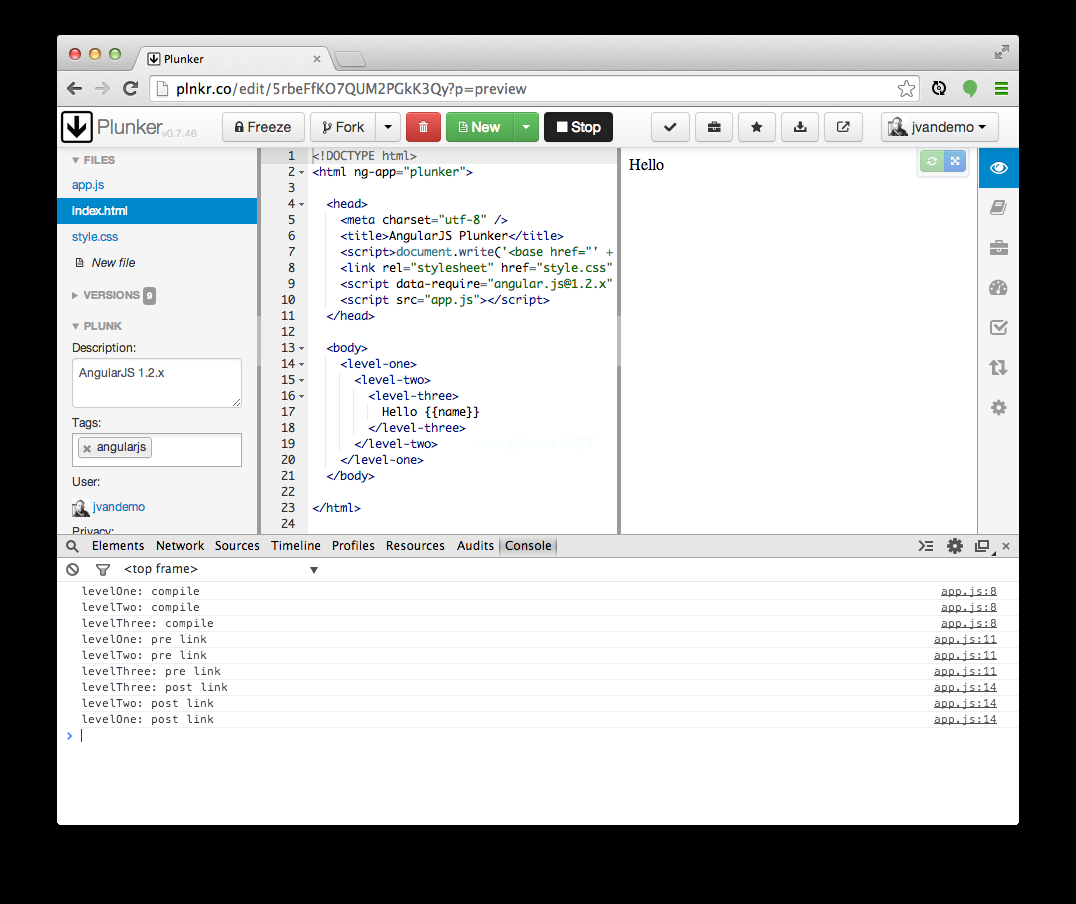 结果很简单。让ng处理三个嵌套指令,每个指令都有自己的编译、预链接、后链接函数,每个函数都会在控制台打印一行来标识自己。
