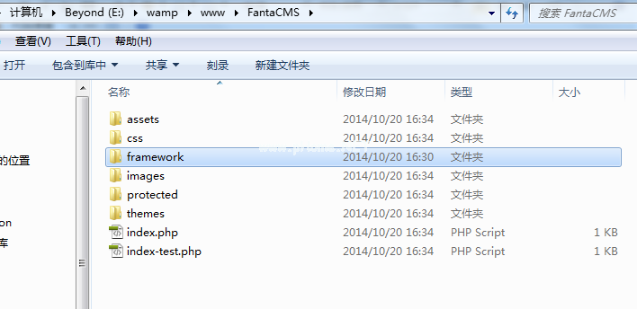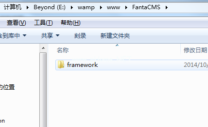 2.在自己的“www”目录下创建阿文应用程序目录,这里我称之为“FantaCMS”,然后解压缩刚刚下载的Yii安装包,然后将解压缩文件中的“framework”目录剪切到“FantaCMS”目录