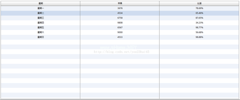 ?可扩展标记语言版本='1.0 '编码='utf-8 '?s 3360应用程序xmlns : FX=' http://ns。土坯房。com/mxm/2009 ' xmlns :s=' library ://ns。土坯房。com/flex/spark ' xmlns : MX=' library ://ns。土坯房。com/flex/MX ' width=' 100% ' height=' 100% ' font size=' 12 ' font family='微软雅黑s 3360布局s 3360基础clayout//s 3360布局FX 3360脚本![CDATA[导入MX。收藏品。arraycollection导入MX。事件。flex事件;[可绑定] //表格数据绑定private var grid array : ArrayCollection=new ArrayCollection([{ week : '星期一,apple:'3676 ',rate:'0.7868'},{week: '星期二,apple:'4534 ',rate:'0.65454'},{week: '星期三,apple:'6758 ',rate:'0.876454'},{week: '星期四,apple:'9808 ',rate:'0.34224'},{week: '星期五,apple:'6567 ',rate:'0.9876523'},{week: '星期六,apple:'9000 ',rate:'0.566777'},{week: '星期日,apple:'4533 ',rate : ' 0.988787 ' }]);/** * 对表格中的比率进行格式化*/私有函数formattadatagrid(item :对象,列: datagridcolumn):字符串{ var tempdata : number=item。费率* 100;var数据: string=数据格式化程序。格式(tempData);返回数据"%";}]]/FX :脚本FX :声明!-格式化数字-MX : numberformatter id='数据格式化程序'精度='2 '舍入='向上/FX :声明MX : vbox宽度='100% '高度=' 100% '填充底部=' 10 '填充左侧=' 10 '填充右侧=' 20 '填充顶部=' 10 '水平方向=中心' MX 3360 dataGrid id=' dataGrid '宽度=' 100% '星期数据字段=' week '/MX : datagridcolumn标题文本='苹果数据字段=' apple '/MX : datagridcolumn标头文本='比率数据字段=' rate '标签函数=' formattagrid '/MX :列/MX : datagrid/MX : vbox/s :应用程序(1)将小数乘以100