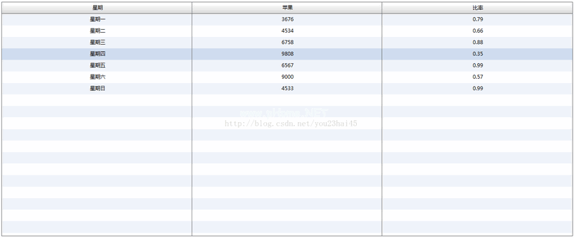 ?可扩展标记语言版本='1.0 '编码='utf-8 '?s 3360应用程序xmlns : FX=' http://ns。土坯房。com/mxm/2009 ' xmlns :s=' library ://ns。土坯房。com/flex/spark ' xmlns : MX=' library ://ns。土坯房。com/flex/MX ' width=' 100% ' height=' 100% ' font size=' 12 ' font family='微软雅黑s 3360布局s 3360基础clayout//s 3360布局FX 3360脚本![CDATA[导入MX。收藏品。arraycollection导入MX。事件。flex事件;[可绑定] //表格数据绑定private var grid array : ArrayCollection=new ArrayCollection([{ week : '星期一,apple:'3676 ',rate:'0.7868'},{week: '星期二,apple:'4534 ',rate:'0.65454'},{week: '星期三,apple:'6758 ',rate:'0.876454'},{week: '星期四,apple:'9808 ',rate:'0.34224'},{week: '星期五,apple:'6567 ',rate:'0.9876523'},{week: '星期六,apple:'9000 ',rate:'0.566777'},{week: '星期日,apple:'4533 ',rate : ' 0.988787 ' }]);/** * 对表格中的比率进行格式化*/私有函数formattadatagrid(item :对象,列: datagridcolumn):字符串{ var temp : number=item。费率;var数据: string=数据格式化程序。格式(临时);返回数据;}]]/FX :脚本FX :声明!-格式化数字-MX : numberformatter id='数据格式化程序'精度='2 '舍入='向上/FX :声明MX : vbox宽度='100% '高度=' 100% '填充底部=' 10 '填充左侧=' 10 '填充右侧=' 20 '填充顶部=' 10 '水平方向=中心' MX 3360 dataGrid id=' dataGrid '宽度=' 100% '星期数据字段=' week '/MX : datagridcolumn标题文本='苹果数据字段=' apple '/MX : datagridcolumn标头文本='比率数据字段=' rate '标签函数=' format datagrid '/MX :列/MX : datagrid/MX : vbox/s 3360应用程序3、实现结果
