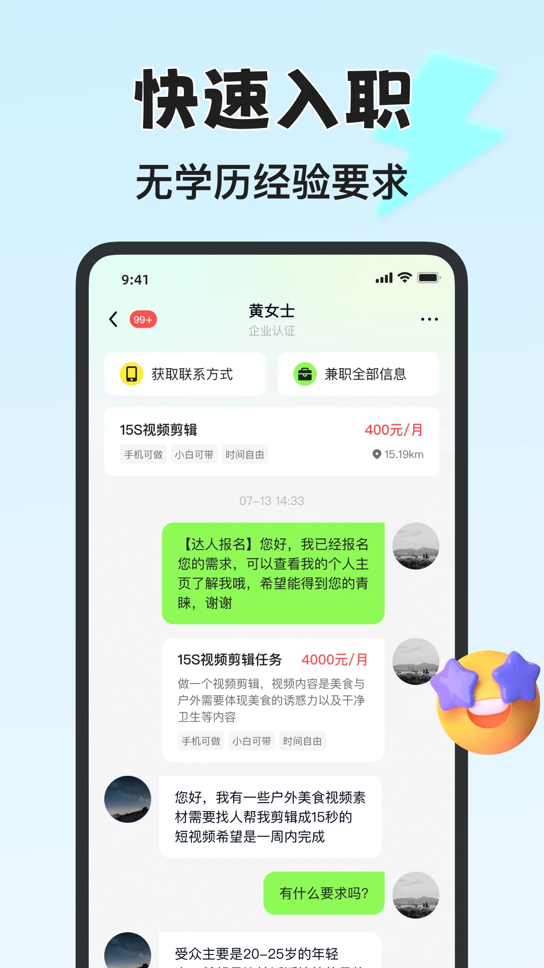 3. 聊天沟通:内置即时通讯功能,方便求职者与雇主直接沟通交流。