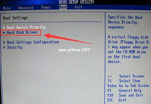 1.按计算机的电源按钮启动计算机。当第一个屏幕出现时,快速按下‘删除’键进入bios界面,选择“启动”选项,然后移动光标选择“硬盘驱动器”并按回车键,如下图所示: